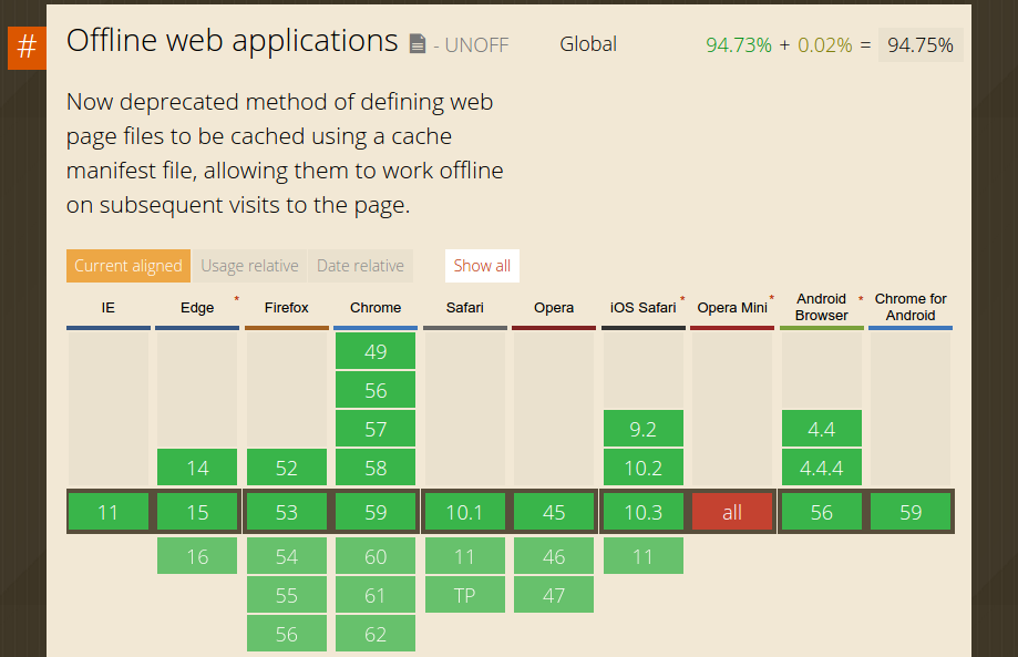 One important thing to note is that despite deprecated, AppCache is still supported by most of the major browsers (as of June 2017), while service worker is either under development or under consideration on Edge and Safari. The momentum of service worker is strong, with notable sites such as Aliexpress, Flipboard, Financial Timesm and more already using service worker to provide offline usability.