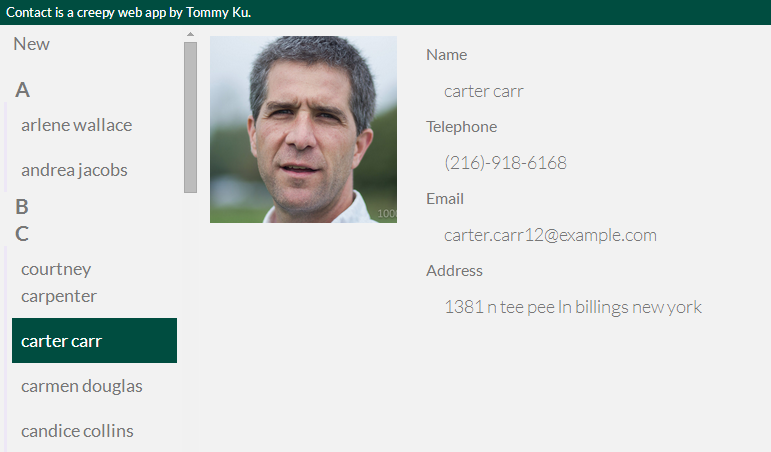 | POST | /contact | name, email, tel, address, photo | Create a new contact record |