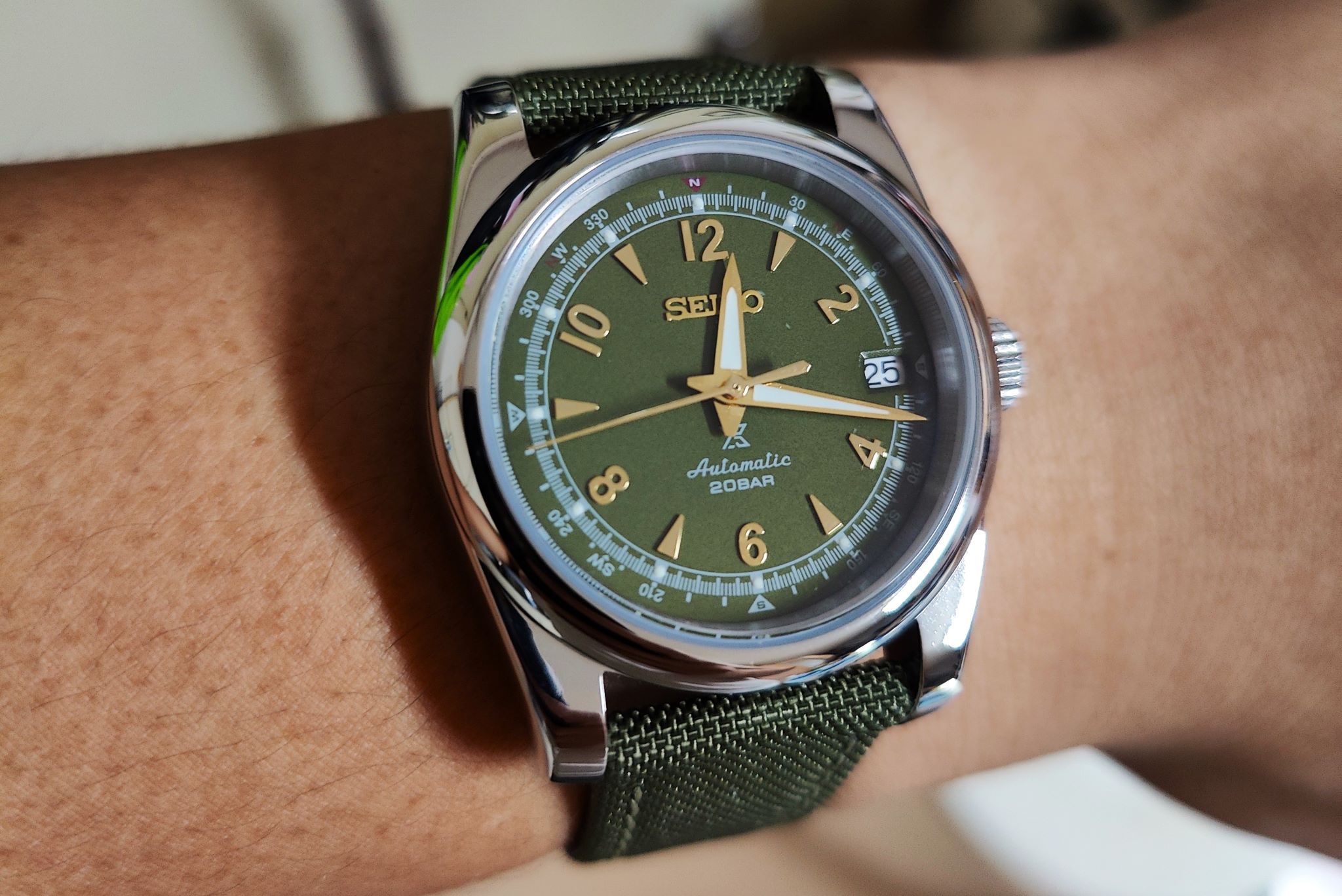 By then I had already owned a Casio MTP-1381, Timex Expedition Chronograph, and a SNK789 from my parents. I wanted a different mechanical dress watch that sweeps. (normal quartz watch ticks once per second, most of time not pointing exactly at the second marks; whereas mechanical watch ticks 6 times, in a sweeping motion) At first I was shopping for the Seiko 5 field watch series which are distant homage to the original field watches, albeit looking more metallic and modern. I was split between the SNK705 and the newer SRPJs and SRPGs in price and feature—none of them is 100% what I wanted. I was so close to buying one but then I saw that the same kind of dial is available online.