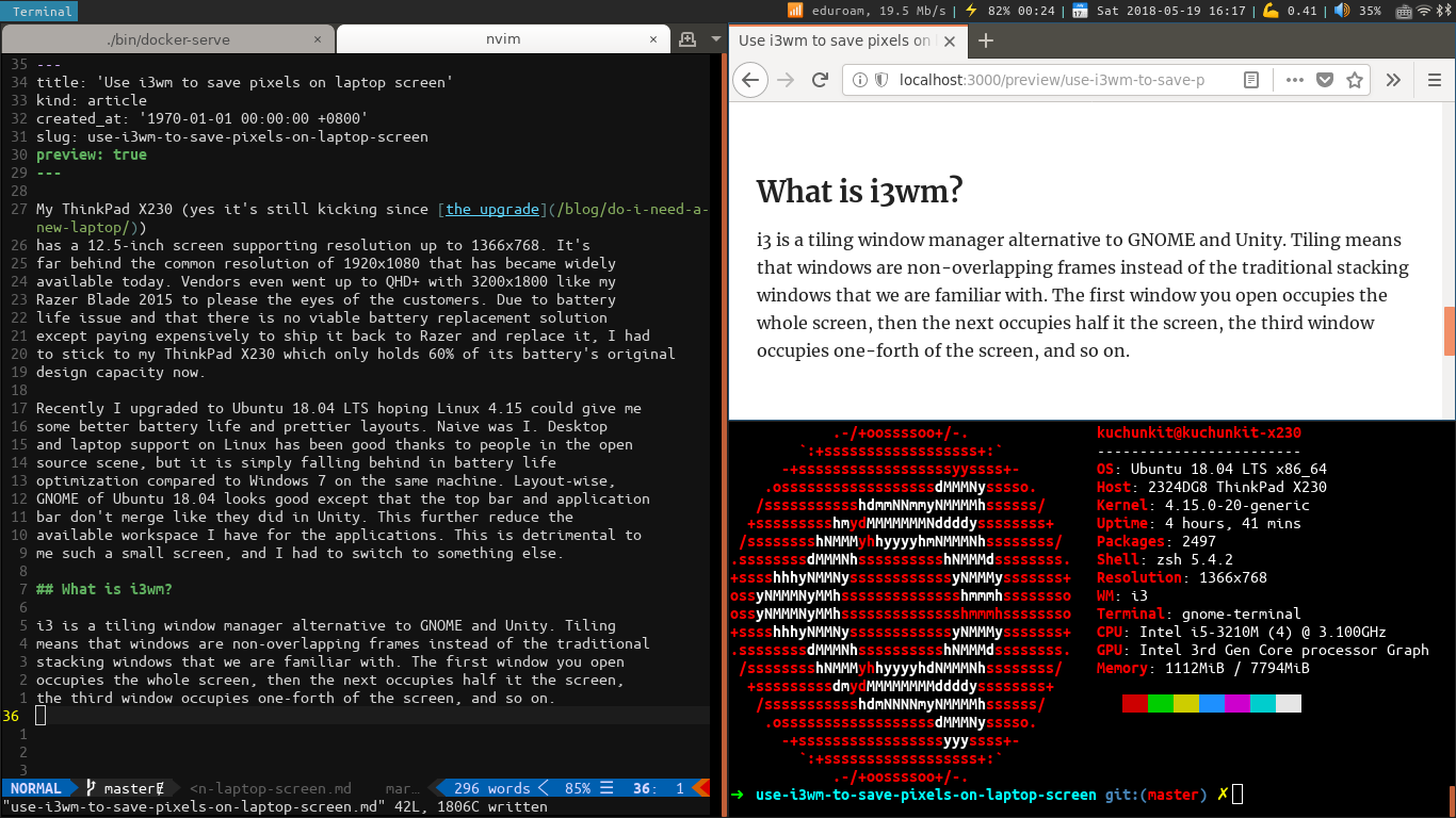 Recently I upgraded to Ubuntu 18.04 LTS hoping Linux 4.15 could give me some better battery life and prettier layouts. Naive was I. Desktop and laptop support on Linux has been good thanks to people in the open source scene, but it is simply falling behind in battery life optimization compared to Windows 7 on the same machine. Layout-wise, GNOME of Ubuntu 18.04 looks good except that the top bar and application bar don’t merge like they did in Unity. This further reduce the available workspace I have for the applications. This is detrimental to me such a small screen, and I had to switch to something else.