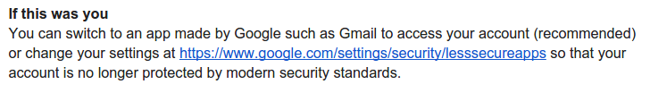 If the first email sent via Laravel is not reaching its destination, logon to Gmail and you are probably seeing a email like this: