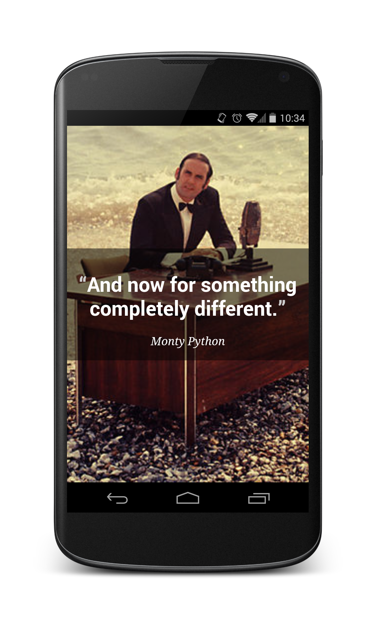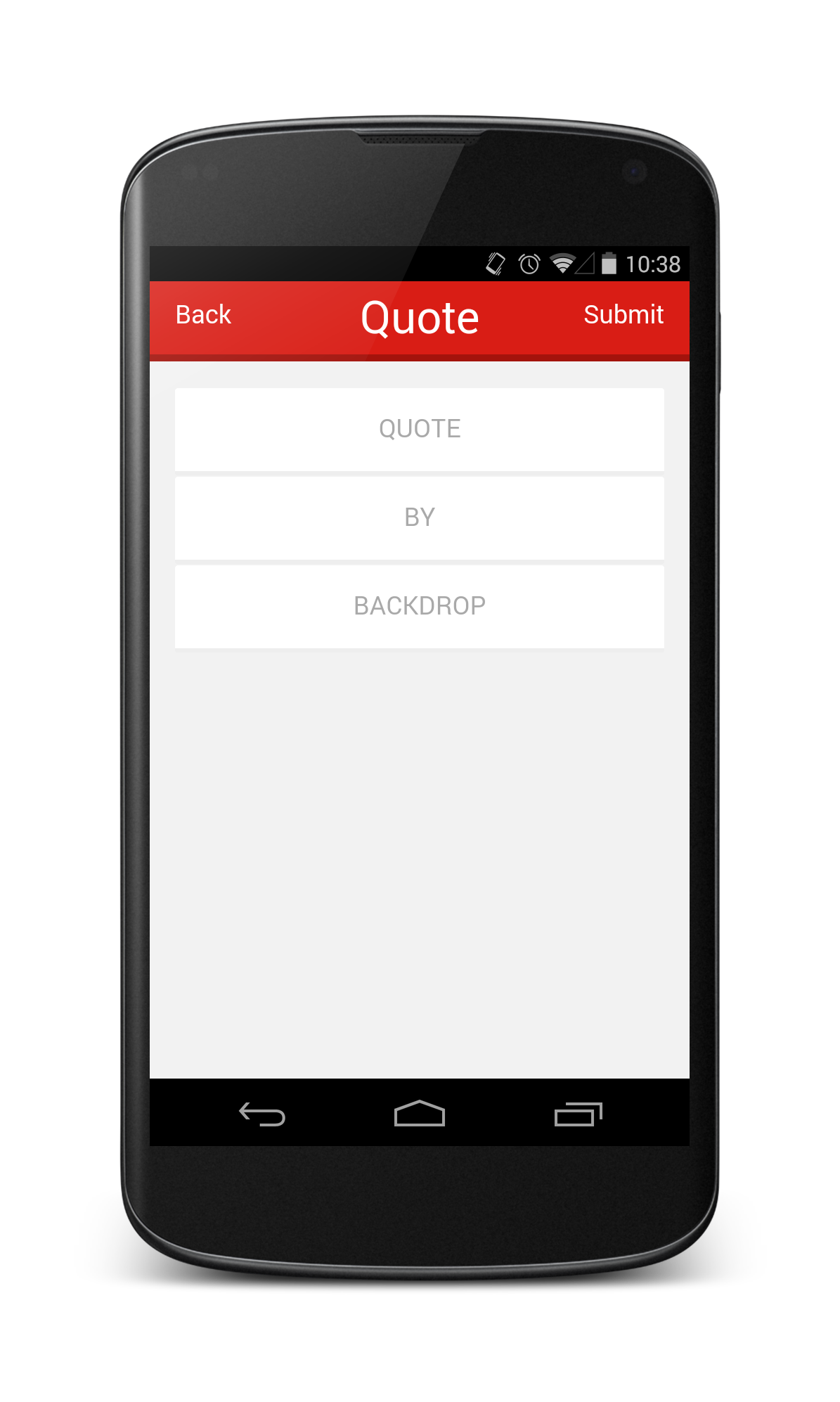 When a user select a quote from the main view or post a new quote, the user will be directed to this “view” state. Parameters to this page are the image, quote and author presented in this template respectively.